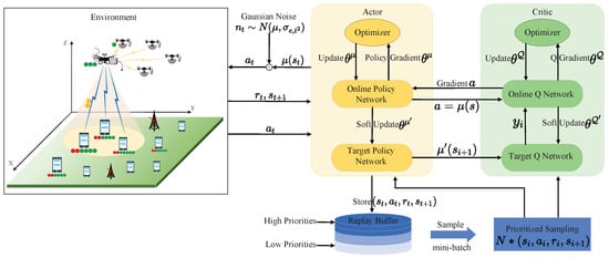 In dynamic environments where UE positions and task requirements are constantly changing, DRL can continuously learn and adapt to these dynamic scenarios through the ongoing interactions between the agent and the environment, thereby obtaining the optimal solution to the optimization problem. Based on the Actor–Critic method, the DDPG algorithm combines the ideas of the deterministic policy gradient (DPG) and the deep Q-learning (DQN) algorithm, and adopts a dual neural network structure. As shown in the framework in Figure 2, the training data for the DDPG algorithm are generated during the interaction with the environment.