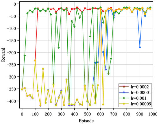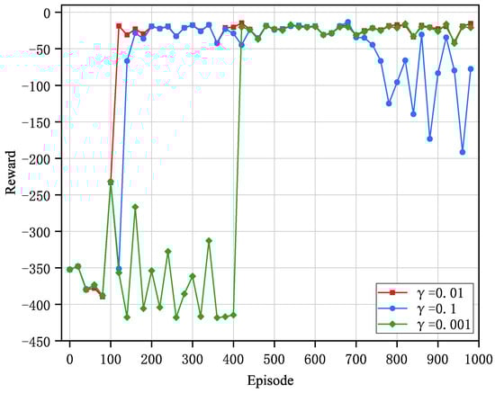 The appropriate configuration of the discount factor () significantly influences the algorithm’s convergence characteristics. A higher value emphasizes long-term returns, potentially leading to overly conservative strategies and unstable performance in certain states. Conversely, a lower value prioritizes immediate rewards, which may result in suboptimal long-term strategies and aggressive behavior, causing instability and fluctuations during training. Figure 4 demonstrates the impact of varying discount factors, specifically , , and , on algorithm performance. Experimental results indicate that when is set to or , the algorithm produces substantial oscillation amplitudes and difficulties in achieving stable convergence. In contrast, setting to significantly reduces oscillation amplitude, thus achieving optimal convergence performance. Consequently, the in this study is established at .