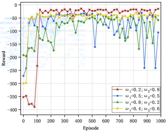 The setting of weighting values in a multi-objective optimization problem should account for the sensitivity of both energy consumption and delay. The system delay weights and energy consumption weights are set within the range of . As shown in Figure 5, it can be seen that the convergence of this algorithm is poor when the weights are evenly distributed. When the sensitivity is skewed towards delay, the optimal strategy cannot be obtained. However, when , , the algorithm’s convergence is more stable, and the optimal strategy can be achieved.
