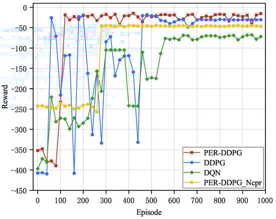 Based on the comparative analysis of the above experiments, the PER-DDPG algorithm demonstrates optimal performance metrics when , , , . Therefore, we will adopt this set of optimized hyperparameter configurations in subsequent experiments.