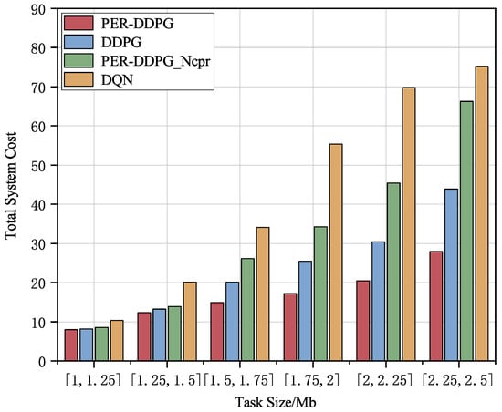 The performance of different algorithms under varying task volumes is compared in Figure 7. We can see that when the task data volume increases from Mb to Mb, the proposed algorithms result in the lowest total delay and energy usage in the system. Compared to PER-DDPG_Ncpr, DDPG, and DQN algorithms, there is a minimum reduction of , , and in total latency and energy consumption, respectively. This demonstrates that the approach explored by the proposed algorithm delivers better results than the other three baseline algorithms. Additionally, the adoption of the data compression technique significantly lowers the overall energy usage for users, and the benefits of data compression become more pronounced as the task data size increases.