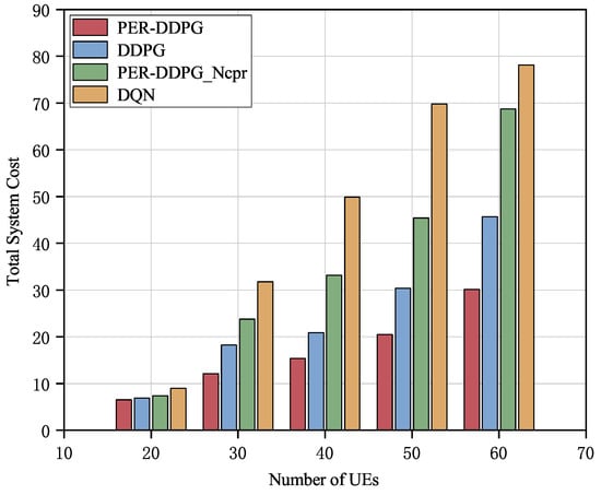 Figure 8 shows the system total cost and the relationship between the amount of UEs. With a growing number of UEs, the total energy usage exhibits a rising trend. This is primarily due to two factors: the increase in the total system cost caused by the growing number of UEs, combined with the limited communication resources of the system, which leads to resource competition among terminals and further increases the system cost. In contrast to the other three algorithms, the approach used in this article is able to allocate the system resources more rationally, and the total cost is always lower. For example, when the number of UEs is 50, the total system cost is reduced by at least , , and compared to PER-DDPG_Ncpr, DDPG, and DQN algorithms, respectively.