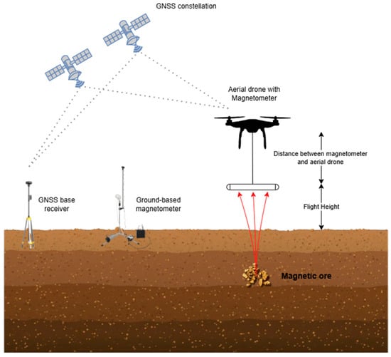 In fact, aerial drones are essential in modern mining operations. The mining process is commonly divided into three main phases: (i) exploration, (ii) exploitation, and (iii) restoration []. During the exploration phase, the first and most critical stage in a mining activity, the identification and evaluation of potential mineral deposits is essential to define the economic viability and ensure efficient resource extraction. In this sense, aerial geophysics plays a crucial role by providing high-resolution subsurface data over large areas efficiently and cost-effectively. By deploying sensors on aerial drones or aeroplanes, it is possible to cover vast and inaccessible areas rapidly, enhance decision-making for planning drilling and sampling operations, and reduce exploration costs compared to traditional ground surveys [,].