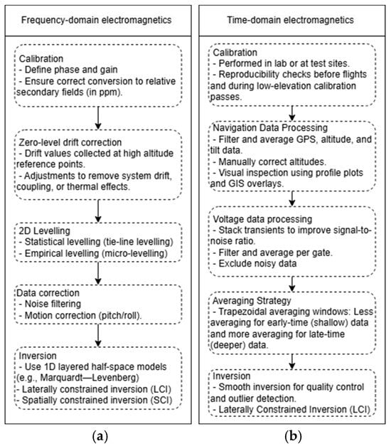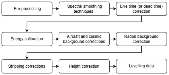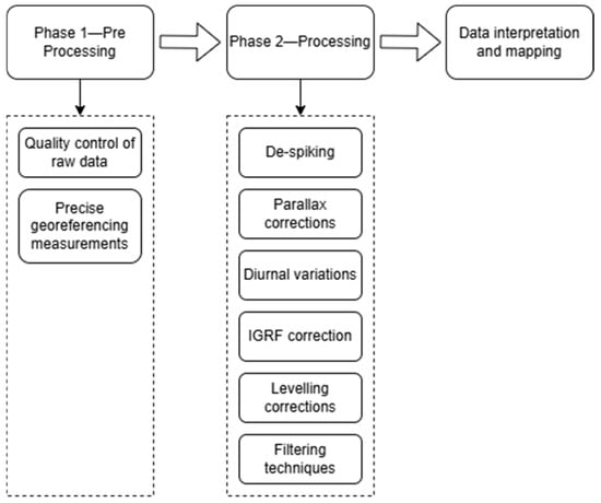 The processing of aeromagnetic survey data follows a systematic sequence of steps to transform raw magnetic measurements into a calibrated dataset optimised for geological interpretation and anomaly detection. The procedure consists of two main phases, pre-processing and processing [], as showcased in Figure 3.