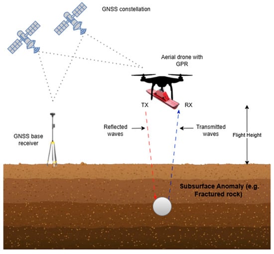 Airborne-based GPR is a cutting-edge technology that utilises electromagnetic waves to penetrate the subsurface and capture detailed geological information []. GPR is valued as a non-invasive, fast, and accurate geophysical method for detecting subsurface anomalies, making it widely applied in the mining industry for various purposes. Its broad application in mining arises from the need to interpret subtle textural variations in radar data, a task that often requires experienced users due to the complexity of geological environments. GPR investigations provide essential data for mine designers, aiding in the understanding of discontinuity systems, subsurface fractures, and groundwater conditions critical for selecting optimal exploitation methods []. Additionally, GPR excels in detecting fractures of various scales, from millimetric to decametric, and its ability to geometrically reconstruct subsurface features has established it as a valuable tool for characterising mining sites and rock masses. This capability significantly enhances quarrying and extraction processes, contributing to improved mining efficiency and safety [].