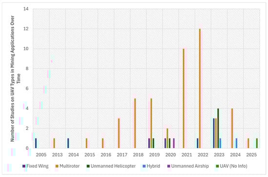 Aerial-drone-borne magnetometry systems have been implemented across various platforms, including multirotors [,,,,,,,,,,,,,,,,,,,,,,,,,,,,,], fixed wings [,,,,,], unmanned helicopters [,,], hybrids [], and unmanned airships []. In Table 2, all the identified mining applications using aerial magnetometry with drones are summarised. The table highlights the platform type, the aerial drone used, the magnetic sensor(s) employed, and the aim or application of each study.