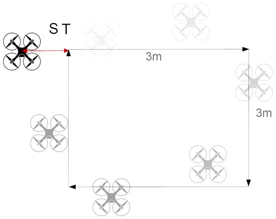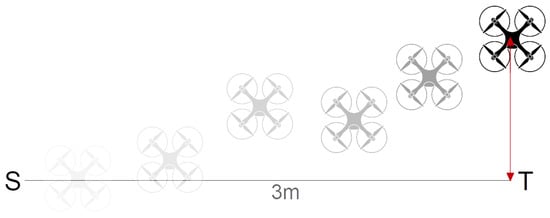 In flight mode, we designed three different flying paths and measured the difference between the expected and actual drone locations. In the first scenario, the drones took off up to 1 m and flew directly to a target position without any rotation. The distances between the start and target positions were 3 and 6 m. We kept the and coordinates of the start and target positions the same and set to . When the drone arrived at the expected coordinate, we landed the drone and measured the distance between and , considering this value as the deviation of the drone. Figure 4 shows how we measured the deviation in linear flight mode using the ESPcopters.
