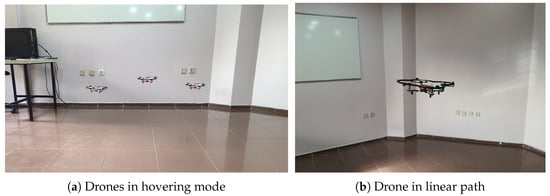 After take-off, in hovering mode, the drone slightly moved to the left or right. We measured the maximum distance that the drone moved from its starting position in hovering mode as the deviation. Figure 7a shows our testbed environment and three drones in the hovering mode and Figure 7b shows a drone flying along a linear path.
