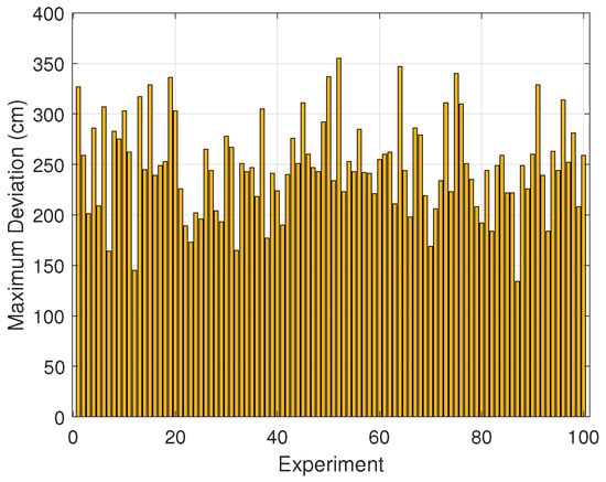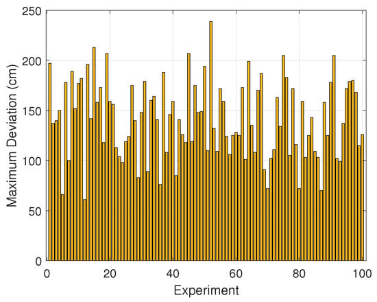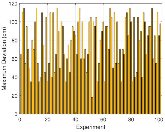Figure 8 shows the observed deviations in 100 experiments in hovering mode. This figure shows that the drone slightly moved in hovering mode in all experiments. In most experiments, the maximum observed deviation was under 100 cm; however, there were a few exceptions, with up to 115 cm deviation. The maximum and minimum observed deviations in hovering mode were 115 cm and 20 cm, respectively. The average deviation over 100 experiments was 77.9 cm, and the standard deviation was 26.4 cm. Thus, in hovering mode, we can expect the drones to move around about 77.9 ± 26.4 cm.
