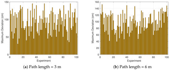 Figure 9 shows the observed deviations when the drones flew directly from the start position toward a target position. We performed the test with 3 m and 6 m path lengths, and their results have been presented in Figure 9a and Figure 9b, respectively. The maximum observed deviation in direct flight mode with the 3 m length was 145 cm; however, in most experiments, the observed deviation was less than 120 cm. The minimum observed deviation was 30 cm. The average deviation over 100 experiments was 92.6 cm, and the standard deviation was 30.8 cm. Thus, in linear flight mode, we can expect the drones to land about 92.6 ± 30.8 cm away from the expected location. For the 6 m flight path, the maximum deviation was 152 cm, while the minimum recorded deviation was 39 cm. The average deviation was 97.8 cm, with a standard deviation of 27.3 cm. These results indicate that in direct flight mode over a 6 m path, the drones typically landed approximately 97.8 ± 27.3 cm away from the intended target location. Although the average deviation slightly increased from 92.6 cm to 97.8 cm, and the maximum deviation also increased, the standard deviations (30.8 cm vs. 27.3 cm) showed a comparable variability in both cases. This may indicate that path length has a minor impact on the flight accuracy of micro drones.