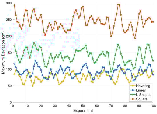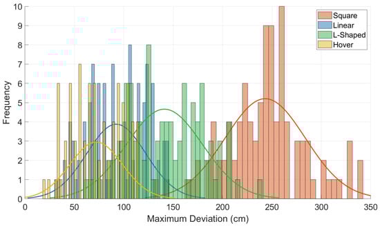 Figure 14 shows the distribution of the maximum deviation values in each flight mode. The figure shows that, in hovering mode (yellow line), the majority of errors fell in the range of 50 cm to 90 cm. This narrow distribution indicates a relatively consistent and stable behavior when the drone was stationary. Most of the deviations in hovering mode cluster around 65 cm. The standard deviation in this mode was also relatively low, showing minimal variability in the drone’s positioning.