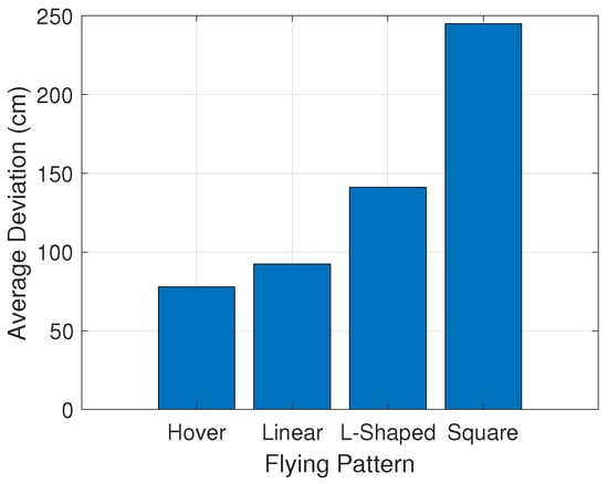 Figure 12 compares the observed deviations in the different flight modes. The figure clearly shows that the deviation of the drone in hovering mode was generally smaller than in all other modes. In almost all experiments, the deviation of the drone in hovering mode remained under 100 cm. The average deviation in this mode was 77.9 cm. This indicates that when the drone remained stationary, its error was relatively low, providing the most stable performance. In contrast, the deviation in 3 m linear mode was notably larger, with an average deviation of 92.6 cm, which was 19% higher than that of hovering. Despite this increase, the linear mode still maintained a moderate level of error, indicating that the drone’s movement along a straight path introduced some variability, but not extreme deviations. The L-shaped mode showed a significant increase in deviation, with an average of 141.11 cm, which was 52.4% higher than the linear mode. This increase can be attributed to the sharp turns in the L-shaped trajectory, leading to greater instability. The square mode exhibited a large deviation of 243.15 cm, reflecting a 212.7% higher deviation compared to hovering mode. The sharp changes in direction during square-shaped movements contributed to the increased error.