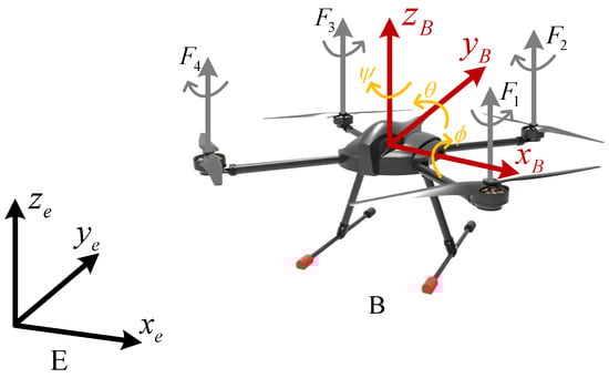 This paper concerns the formation and attitude tracking control of N quadrotor UAVs. The structure of UAVs is shown in Figure 1. The UAV utilizes four rotors to facilitate its six degrees of freedom (DOF) in motion, with each UAV being independently controlled by a brushless DC motor. To describe the translational motion (position loop) and rotational motion (attitude loop) of the UAV, an earth inertial coordinate frame and a body coordinate frame are defined, respectively, as illustrated in Figure 1. Similarly, the mathematical model of any UAV can be represented as a position subsystem and an attitude subsystem.