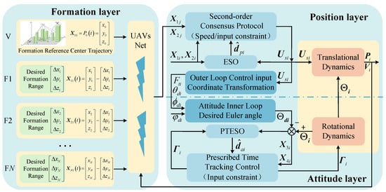 In this section, formation control is divided into three layers: formation, position, and attitude. Figure 2 shows the framework of the distributed formation and tracking controller for multi-UAV system.