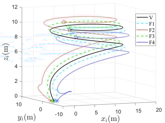 According to the translational dynamics and the formation control goals, the coordination variable for the UAVs are set as , , where . Additionally, , refers to the reference tracking trajectory for the UAV formation. By combining with Equation (2), the following kinematic model for multi-UAV cooperative formation can be derived: