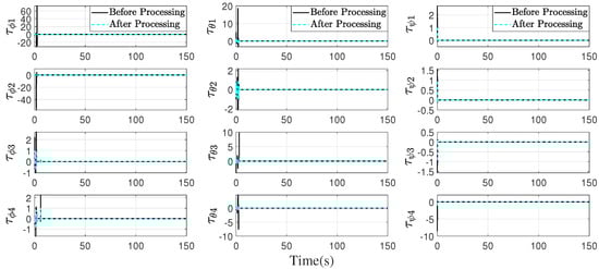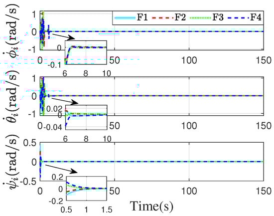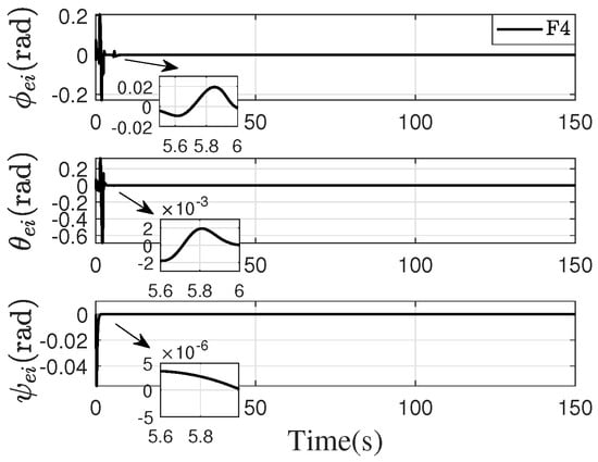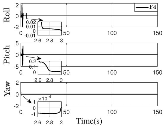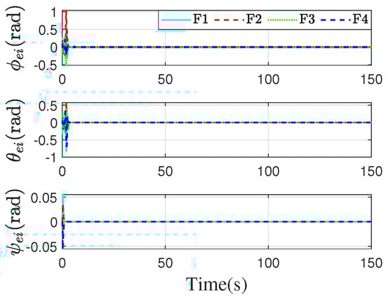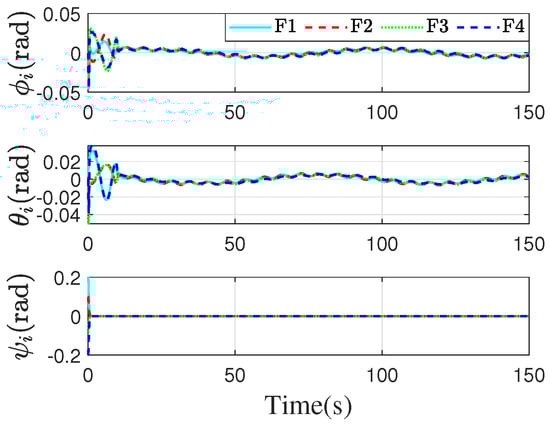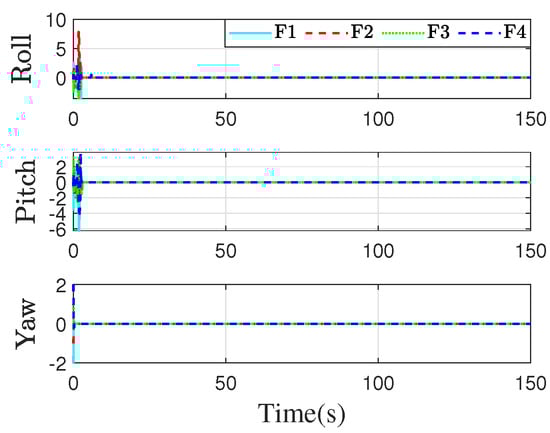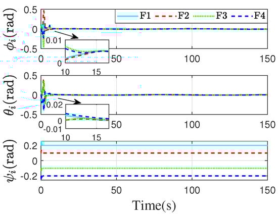Figure 14 shows the dynamic response curve of the sliding mode surface for follower UAVs. As can be seen from Figure 15, the intermediate control variables of the position loop strictly remain within the limitation range [−5, 5]. Figure 16 shows the control torque of the follower UAVs before and after saturation treatment. Evidently, the control torques after saturation processing all fall within the range of [−1, 1]. To more clearly illustrate the prescribed time convergence of the sliding mode surface and attitude angle errors within s and s, an example of the error curves for a single UAV (F4) is presented, as shown in Figure 17 and Figure 18.