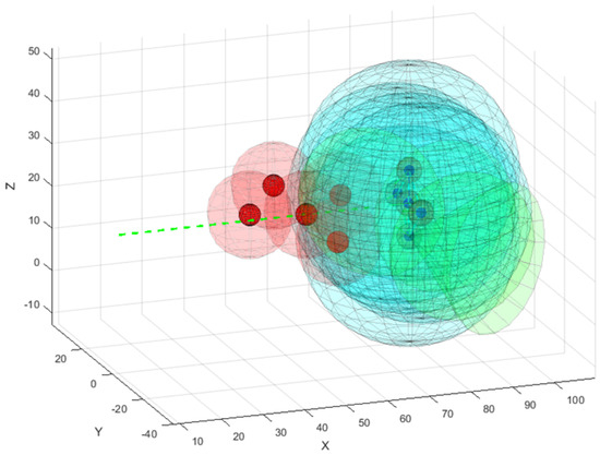 The collision detection between UAVs and obstacles is based on a spherical collision model. Assuming each UAV can be simplified as a sphere with radius , the collision condition between UAV i and obstacle j is given by the following equation: