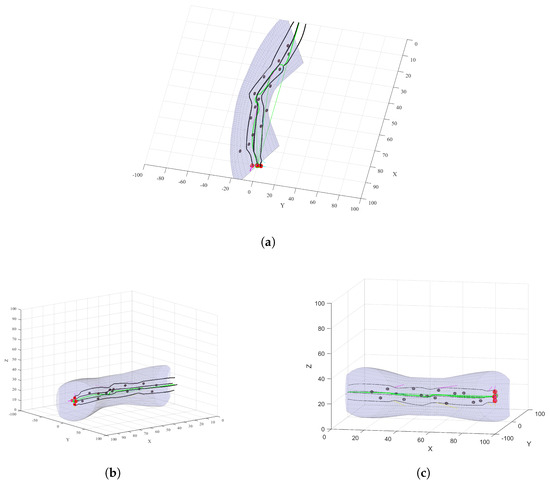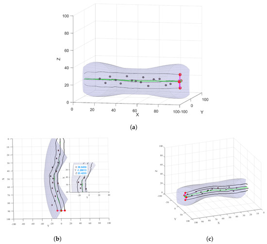 Here, and denote the tunnel’s starting and ending points, respectively, h represents the maximum offset of the curve, and the term ensures the curve reaches its maximum offset at the midpoint.
