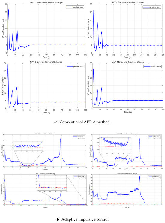 For the i-th UAV, we define the position error vector , with Euclidean norm . Based on Lyapunov stability theory, we design the triggering condition as follows: