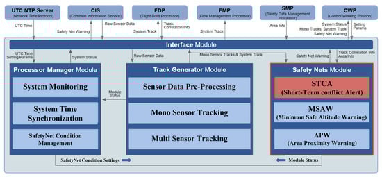 The trajectory prediction and collision assessment model based on deep learning proposed in this paper is embedded within the Short-Term Conflict Alert (STCA) component of the Safety Nets module, as designed by Korean Air. The Surveillance Data Processor (SDP), illustrated in Figure 2, uses a deep neural network to predict each UAM vehicle’s flight path in real time after ingesting fused surveillance tracks from the Common Information Service and sensors both on board and on the ground. A collision prediction algorithm is then executed. For rapid operational response, STCA categorizes these predicted trajectories and collision alerts into one of four levels: Safe, Caution, Warning, or Collision. The resulting alerts are routed seamlessly to ground-based air traffic control systems or to an Unmanned Traffic Management interface for autonomous operations. By integrating trajectory prediction and collision assessment for multiple aircraft directly within STCA, the proposed framework markedly enhances the safety, responsiveness, and scalability of urban air mobility traffic management.