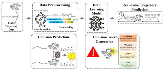 This study introduces a comprehensive deep learning-driven framework designed to enhance the accuracy and operational efficiency of trajectory prediction and collision risk assessment in UAM environments. The overall system workflow, as presented in Figure 3, is composed of the following core components: