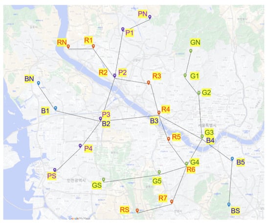 Building upon the demonstration network of planned commercial UAM corridors within the Seoul Capital Area, eight vertiports were meticulously designated, and 56 distinct flight corridors connecting each pair (see Figure 4) were precisely defined. Simulation data were subsequently produced using the VTG—a high-fidelity tool developed by Korean Air for internal validation. The VTG rigorously simulates Lift- and Cruise-type eVTOL aircraft, enabling the comprehensive evaluation of flight trajectory integrity, precise collision risk quantification, and robust air traffic management performance. As depicted in the map, P, G, B, and R denote Purple, Green, Blue, and Red routes, respectively, with the suffixes N and S indicating the North and South vertiports.