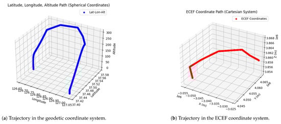 Comparison of flight trajectory representations. (a) A trajectory represented in the geodetic coordinate system, and (b) the same trajectory after transformation into the ECEF coordinate system, which yields a more linear representation due to unified metric scaling.