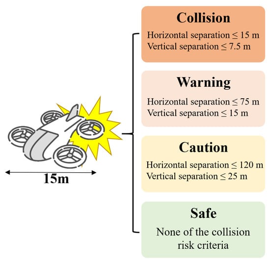 To rigorously validate the practical applicability of our proposed trajectory prediction framework, we integrated the developed LSTM–Attention-based prediction model with a collision prediction algorithm. This module utilizes trajectory estimates projected 10 s into the future (forward-length = 100), in order to assess potential conflicts and classify flight states into four pre-defined risk levels: Level 4 (Safe), Level 3 (Caution), Level 2 (Warning), and Level 1 (Collision). These classification levels are designed to support safe and reliable UAM system operations by providing tiered risk assessments that align with the urgency and severity of potential mid-air conflicts.