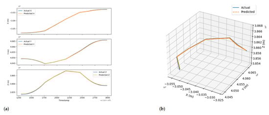 Case study evaluation on UAM data not used during training: (a) decomposed two-dimensional coordinate predictions for the x, y, and z axes and (b) full three-dimensional trajectory overlay comparing true and predicted paths.