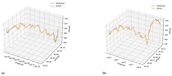 Table 8 summarizes the predictive accuracy of the LSTM–Attention model evaluated on real-world helicopter flight logs, demonstrating an overall RMSE of 0.4412, MAE of 0.1654, and MSE of 0.1946. Additionally, Figure 10 illustrates two distinct three-dimensional flight trajectories—Flight Path 1 and Flight Path 2—employed solely for case study analysis and not included in the model’s training phase. In both cases, the close alignment between predicted and actual trajectories, marked by minimal spatial deviations, confirms the LSTM–Attention architecture’s capability to accurately replicate complex three-dimensional flight behaviors characteristic of rotary-wing operations. These findings thus reinforce the robustness, reliability, and practical relevance of the proposed model for trajectory prediction within realistic UAM operational contexts.