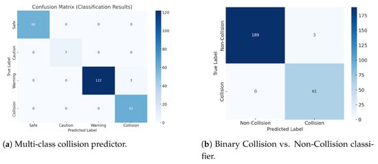 Confusion matrices for (a) multi-class collision prediction across Safe, Caution, Warning, and Collision conditions and (b) binary Collision vs. Non-Collision classification.