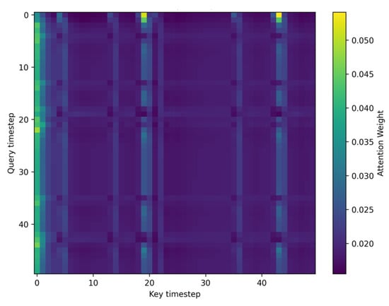 As illustrated in Figure 12, analysis of the LSTM–Attention model’s attention heatmap reveals that the initial timestep—corresponding to the sequence’s departure point—consistently receives the greatest weight, indicating that the model prioritizes departure-point information as the fundamental basis for trajectory prediction. Furthermore, recurrently amplified attention in certain intermediate timesteps demonstrates the model’s capacity to pinpoint and emphasize those moments that exert decisive influence on prediction under dynamic trajectory conditions. Importantly, this pattern of salient timestep detection further validates the appropriateness of a 50-step look-back window for optimizing predictive accuracy. Collectively, these findings confirm that the model transcends simple sequence compression by dynamically identifying and weighting critical timesteps, thereby substantially enhancing UAM flight path prediction performance.