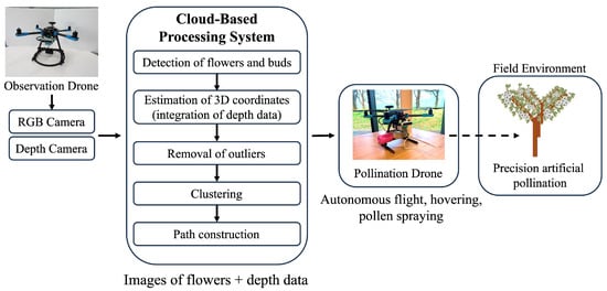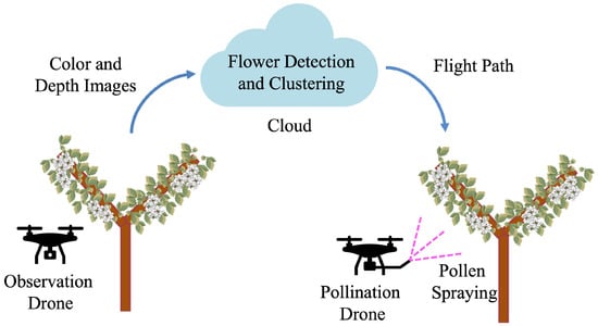 In this study, we focus on the development of a drone-based pollination system that detects the blooming status of pear flowers and autonomously performs pollination. The proposed system consists of two drones that work together to ensure an efficient pollination process (Figure 1). The first, which is called the observation drone, is responsible for monitoring pear trees, whereas the second, which is called the pollination drone, performs actual pollination. The observation drone is tasked with monitoring the pear trees by simply flying between the pear trees and capturing both color and depth images of the blooming flowers. These images are then transmitted to a cloud-based server, where both flower detection and spatial clustering are performed using computer vision algorithms. Then, a flight path is generated based on the processed data for the pollination drone. The pollination drone then navigates to the identified flower clusters autonomously and performs targeted pollen spraying.