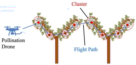 In this study, we propose a cluster-based flight path construction method for use with autonomous drone pollination in orchard environments. The proposed system transmits RGB-D data that have been captured by the observation drone to a cloud-based platform, where the three-dimensional coordinates of the blooming pear flowers are estimated. Pear flowers typically bloom in dense clusters along each branch, which means that it is reasonable to define the spraying targets at the level of flower clusters rather than at the individual flower locations, as shown in Figure 2. A clustering algorithm is therefore applied to the estimated spatial data to group the flowers based on their proximity and thus effectively identify the natural cluster formations on branches. Using the centroids of these clusters, the system then generates a structured flight path for the pollination drone to enable efficient navigation and precise pollen spraying while also minimizing unnecessary movements.