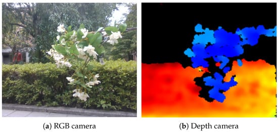 To illustrate how the RGB and depth data are jointly used for accurate 3D flower localization, Figure 4 compares a conventional RGB image and its corresponding depth heatmap. In the RGB image, the pear flowers are clearly visible, whereas the heatmap reveals the shapes and the relative depths of the flowers through the various color gradients. By analyzing the RGB and depth images in combination, the system estimates the 3D coordinates for each flower accurately. These estimated positions then serve as the basis for construction of an efficient flight path for the pollination drone.