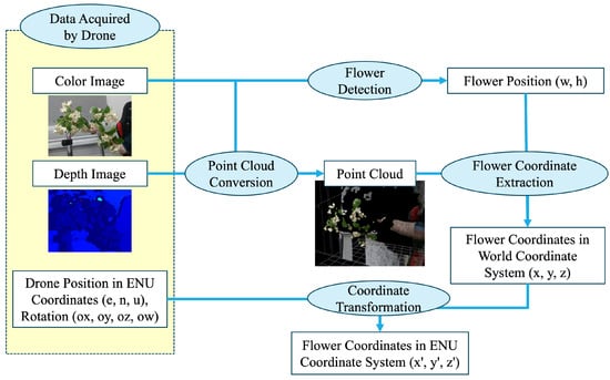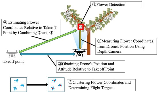 Using RGB-D processing, the overall procedure for the proposed drone path construction method is shown in Figure 5. Initially, the system performs flower detection using images captured by an RGB camera. Subsequently, it estimates the distance from the camera to each detected flower based on the corresponding depth data. By further calculating the distance from the drone’s takeoff location to the image capture position, the system can estimate the absolute coordinates of the flowers. Then, it clusters the detected flower positions using a suitable clustering algorithm and determines the centroid of each cluster. The system plans the drone’s flight path to sequentially visit these centroids. By hovering in front of each centroid, the drone can spray pollen in a manner that simultaneously targets multiple flowers within the cluster, thereby enhancing pollination efficiency. The detailed procedure for constructing the flight path is organized into the following steps: