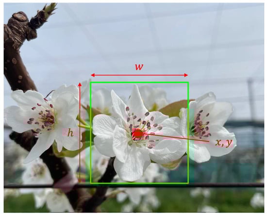 For pear flower detection, YOLO (You Only Look Once) [,,] is employed. YOLO is a state-of-the-art, deep-learning-based object detection algorithm widely used in computer vision applications, particularly known for its high detection accuracy and real-time performance. Unlike traditional region-based methods, YOLO processes the entire image in a single forward pass through a neural network, thereby directly predicting bounding boxes and associated class probabilities for multiple objects.