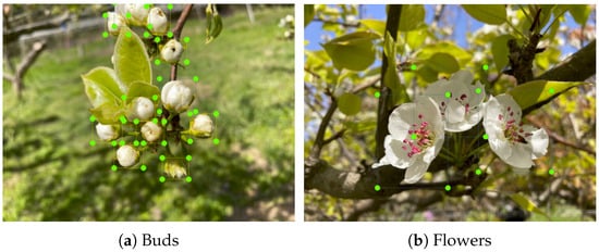 To detect pear flowers that are suitable for pollination, flower states are classified using two labels: bud and flower. The bud label indicates that the pear flower has not yet bloomed and is not ready for pollination. Because the bud remains closed at this stage, artificial pollination cannot be performed; hence, these flowers are excluded from the pollination process. By contrast, the flower label indicates that the pear flower has fully bloomed and has reached a state where artificial pollination is possible. Flowers in this state are the targets for drone-assisted pollination. A dataset labeled with bud and flower is used to train the YOLO object detection algorithm. This classification is a crucial step in the pollination process because accurately distinguishing between buds and flowers ensures efficient and reliable pollination.