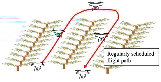 To monitor the pear trees, the observation drone is programmed for daily flights through the orchard. The flight path is predefined using the ROS (Robot Operating System) (Figure 8), ensuring that it follows a predetermined route at regular intervals. This systematic flight pattern allows the drone to operate stably within the orchard while efficiently observing different areas.