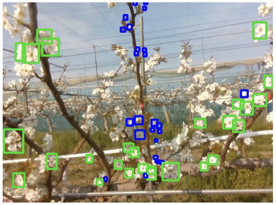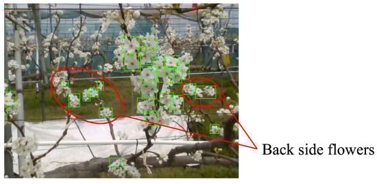 An attempt to eliminate such false detections at the time of image capture by the dynamic adjustment of the recorded footage would significantly increase system complexity and processing time. Additionally, in real-world agricultural environments, pear flowers are distributed irregularly, which makes it difficult to completely avoid false detections through real-time adjustments. Given these constraints, the proposed method does not incorporate specific measures to filter out unwanted flowers at the time of image capture.