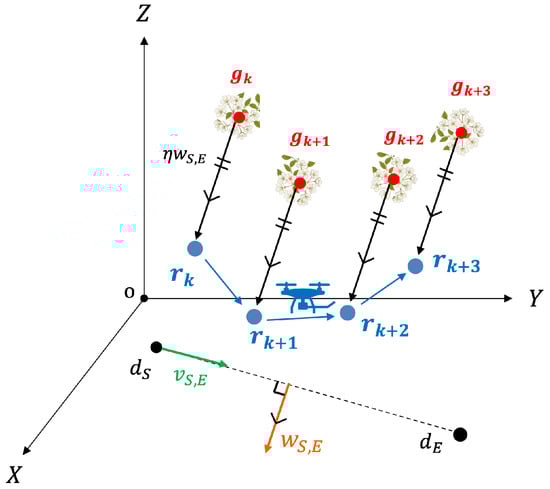 To transform the flower’s position from the drone-relative coordinate system to the ENU coordinate system, we use the drone’s position and attitude corresponding to the timestamp closest to the image capture time. The ENU coordinates of a flower can be transformed into using , (), and . This transformation enables the representation of flower locations in a consistent geographic reference frame, which is essential for subsequent flight path planning. Let the coordinates of the n-th detected flower be denoted by and let the total number of detected flowers be N. The set of all detected flower positions is then represented as