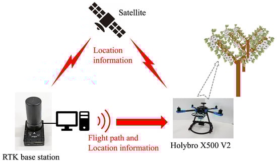 - Experimental Validation with RTK-Based Control: We demonstrated the system’s effectiveness through real-world experiments using RTK-GNSS (Global Navigation Satellite System)-based flight control to confirm the accuracy of flower detection, position estimation, and autonomous pollination in orchard environments.