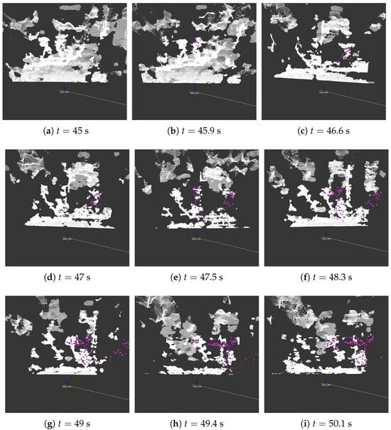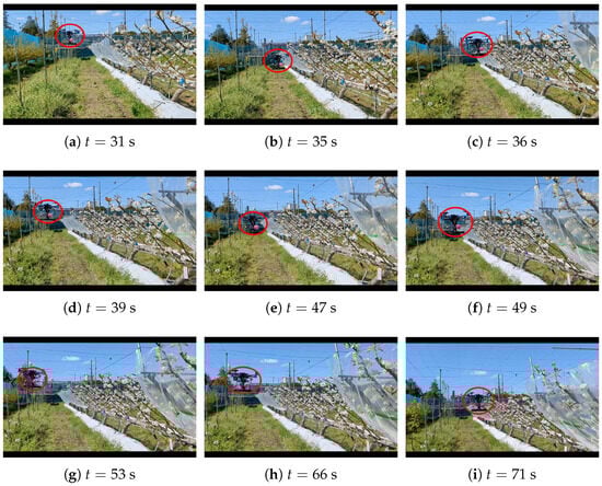 Figure 22 shows the observed appearance of the pollination drone at elapsed time t after takeoff. The figure captures the drone in flight along the computed trajectory, which it generated using the centroids of the clusters obtained in Figure 21a. We visually confirmed that the drone stopped in front of each branch and hovered at locations where flowers were present, which indicates that the planned path aligned well with the actual spatial distribution of the flowers.