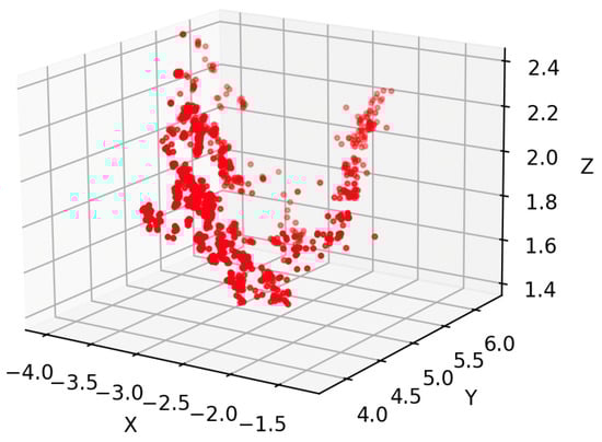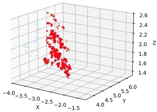 In the proposed method, unnecessary points are removed by ignoring flower positions that are located too far from the observation drone. Specifically, for each detected flower, if the distance between its coordinates and the position of the drone at the time of capture exceeds a predefined threshold , we consider the flower to be on the backside and exclude it. The threshold is determined in advance based on the measurement of branch lengths. Let denote the set of flower positions after unnecessary points are removed: