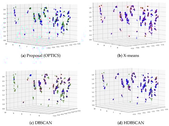 To enable a performance comparison, the results of X-means [], DBSCAN [], and HDBSCAN [] are also presented.