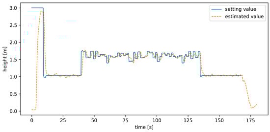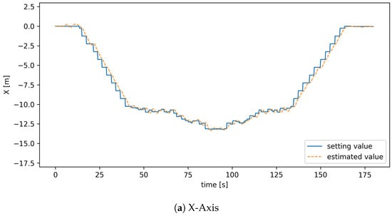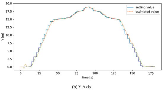 Figure 23 shows the flight log data along the X and Y axes, as recorded by sensors mounted on the pollination drone. The blue lines represent the predefined waypoints generated by the proposed method, whereas the orange lines indicate the estimated flight trajectories based on the drone’s onboard sensors during operation. From Figure 23, it can be observed that there was no significant deviation between the planned trajectory and the estimated flight path. Although the setpoints were defined discretely, resulting in minor visual differences in the trajectory shape, the drone successfully passed through nearly all of the specified waypoints. This result stems from the use of a Real-Time Kinematic positioning system, which provides highly accurate localization. Therefore, the adoption of RTK enables the spraying drone to be precisely controlled within the X–Y plane.