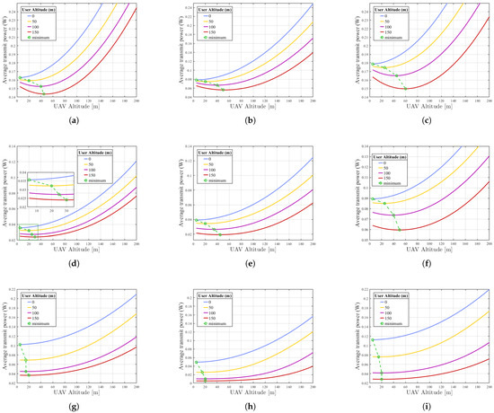 Average required transmit power versus UAV altitude in dense urban, urban, and suburban environments. (a) Exponential truncated distribution in a dense urban environment; (b) Gaussian truncated distribution in a dense urban environment; (c) uniform truncated distribution in a dense urban environment; (d) exponential truncated distribution in urban environment; (e) Gaussian truncated distribution in an urban environment; (f) uniform truncated distribution in an urban environment; (g) exponential truncated distribution in a suburban environment; (h) Gaussian truncated distribution in a suburban environment; (i) uniform truncated distribution in a suburban environment.