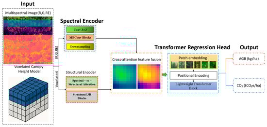 where df is the final fusion dimensionality. The resulting fused tensor encapsulates both the spectral intricacies and three-dimensional structural characteristics of the vegetation, yielding a semantically aligned and information-rich feature map. This integrated representation is then forwarded to the Transformer-based regression head, which performs the final prediction of above-ground biomass and carbon sequestration values.