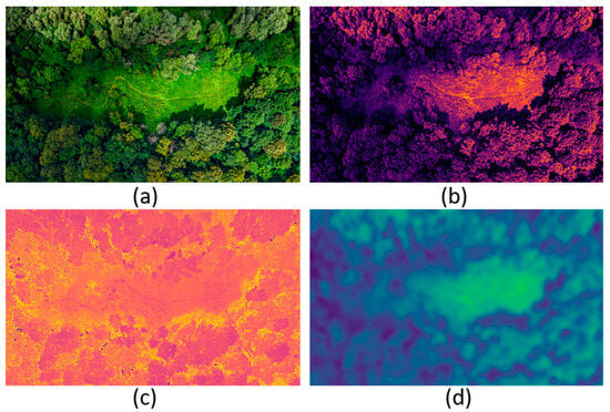 Example Input Modalities. (a) UAV-captured RGB image of the forest canopy. (b) False-color near-infrared (NIR) composite highlighting vegetation health. (c) Vegetation index map used as spectral input. (d) CHM represents structural information.