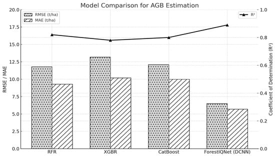 Performance comparison of different modeling approaches for estimating AGB, based on RMSE (left Y-axis shows the RMSE), MAE, and coefficient of determination (R2). Traditional machine learning models—Random Forest Regression (RFR), XGBoost Regression (XGBR), and CatBoost—demonstrate moderate predictive capabilities, with R2 values ranging from 0.78 to 0.82 and RMSEs between 11.8 and 13.2 t/ha. In contrast, the proposed ForestIQNet model, built on a deep convolutional neural network (DCNN) architecture, substantially outperforms the baselines. It achieves the highest R2 score of 0.89 and reduces both RMSE and MAE to 6.5 and 5.7 t/ha, respectively. These results underscore the effectiveness of deep learning in capturing the complex spectral and structural patterns inherent in multimodal UAV imagery for forest biomass estimation.
